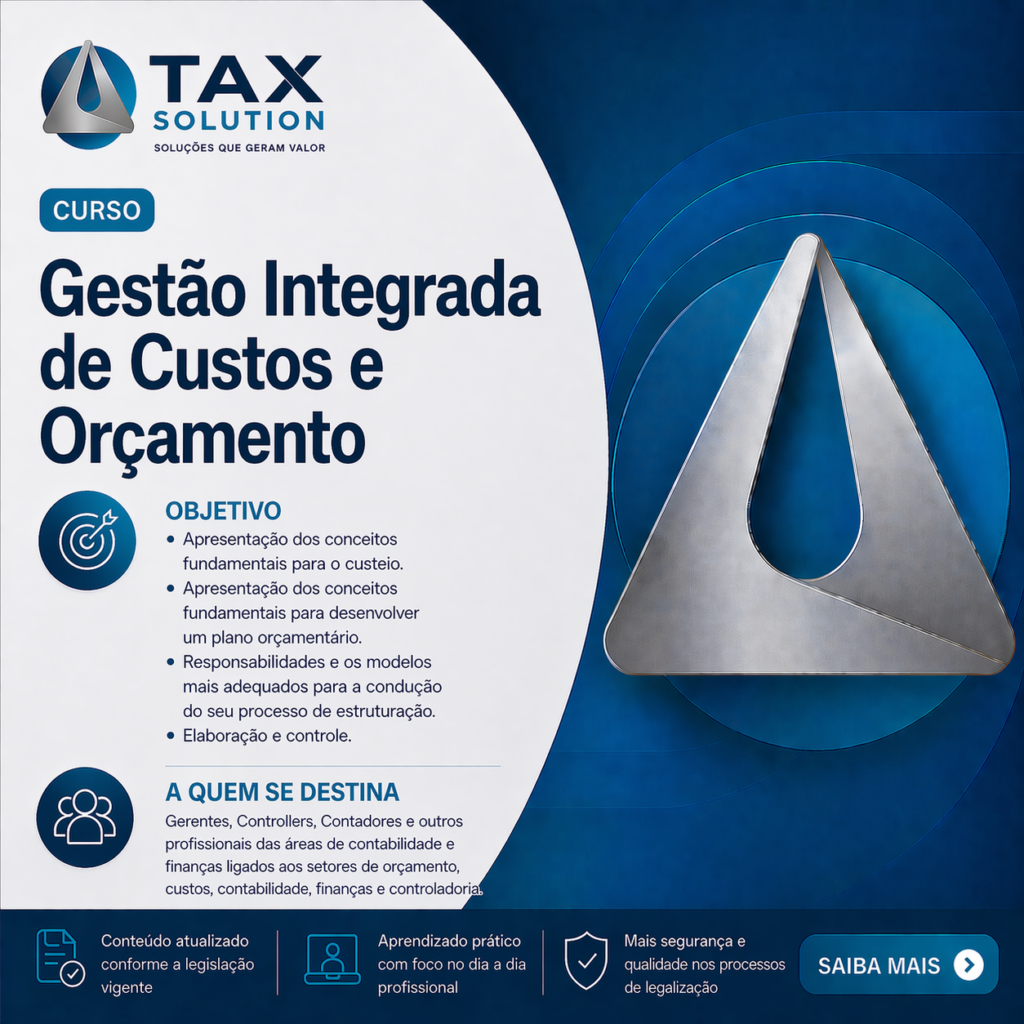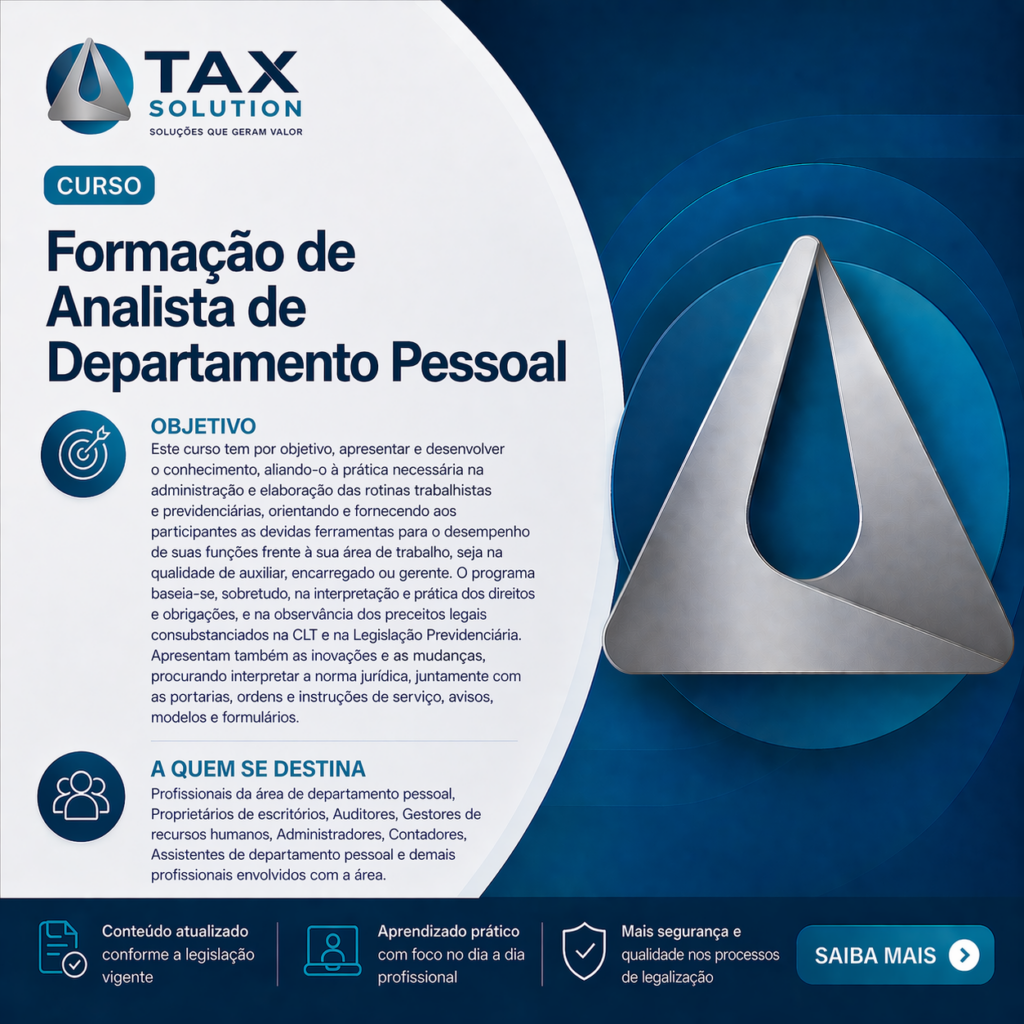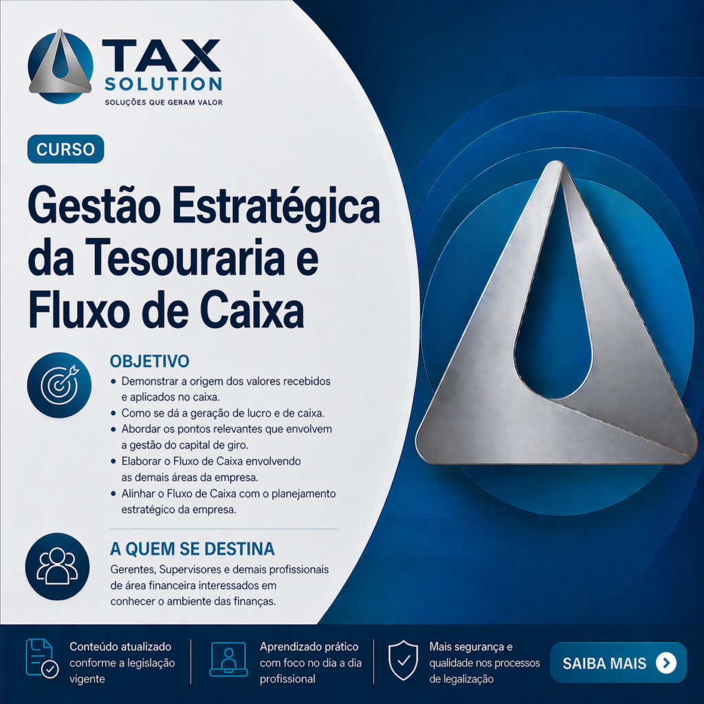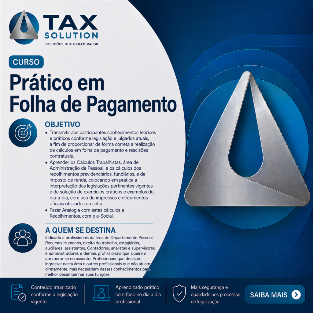 Assim sendo, a TAX SOLUTION oferece o Treinamento In Company, programa de cursos especialmente adaptado a cada empresa, conforme suas particularidades e necessidades, com tratamento personalizado dentro do próprio ambiente de trabalho. Além do profissional obter conhecimento e reciclagem constantes dentro do seu campo de atuação, o treinamento proporciona facilidades também para a empresa, pois diminui substancialmente as perdas geradas no processo.