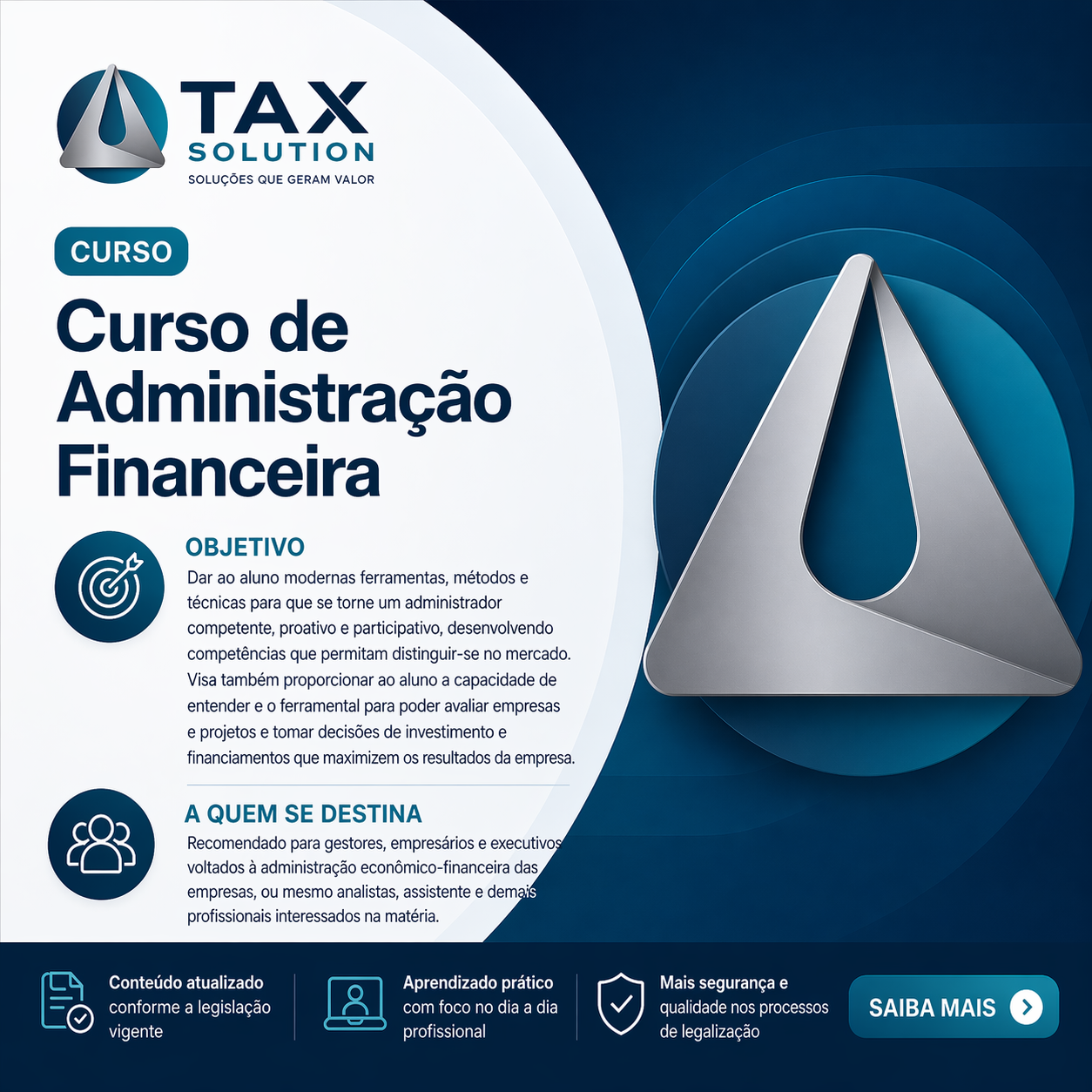 Dar ao aluno modernas ferramentas, métodos e técnicas para que se torne um administrador competente, proativo e participativo, desenvolvendo competências que permitam distinguir-se no mercado. Visa também proporcionar ao aluno a capacidade de entender e o ferramental para poder avaliar empresas e projetos e tomar decisões de investimento e financiamentos que maximizem os resultados da empresa.